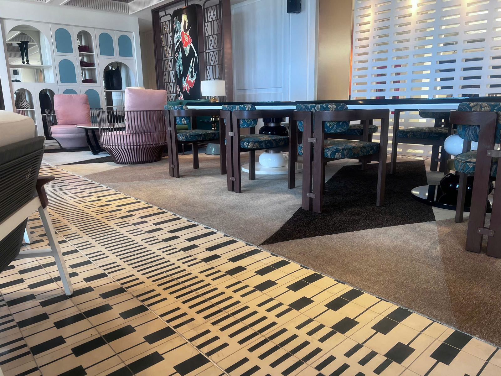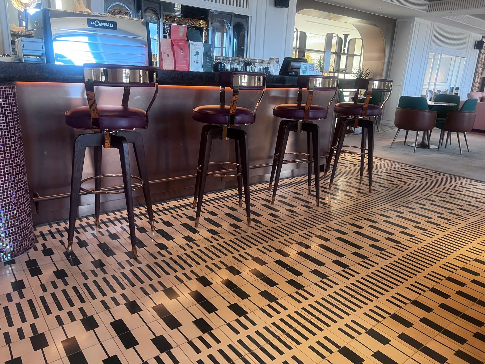 Hillton Phú Quốc mang đến một không gian nội thất hiện đại và sang trọng, nổi bật với hệ thống gạch nghệ thuật được thiết kế ấn tượng. Khu vực quầy bar sử dụng họa tiết gạch độc đáo, tạo điểm nhấn thị giác mạnh mẽ, đồng thời góp phần nâng tầm trải nghiệm không gian. Sự kết hợp hài hòa giữa vật liệu, ánh sáng và bố cục nội thất giúp tổng thể trở nên tinh tế.